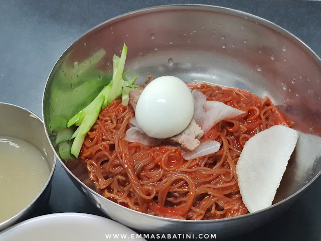 Menu andalan dari rumah makan ini adalah Cold Buckwheat Noodles (mul naengmyeon-물냉면) dan Spicy Buckwheat Noodles (bibim naengmyeon-비빔냉면). Kedua makanan ini adalah mie dingin, bedanya mul-naengmyeon terdapat kuah dan bibim tidak kuah dengan sedikit pedas. Jujur untuk lidah orang Indonesia, mungkin merasa aneh makan makanan dingin. Jadi bila ingin coba, saya sarankan Spicy Buckwheat Noodles (bibim naengmyeon), walau dingin tapi 'berasa' dan pedas.